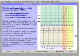 1) Il primo modulo è basato sulle lezioni: una serie di schede illustrate da immagini, dati e grafici. Gli argomenti affrontati sono i 3 periodi della storia della popolazione, i conti dei demografi (saldi e tassi), la densità e la carta della distribuzione, la piramide della popolazione, infine, la popolazione italiana. |